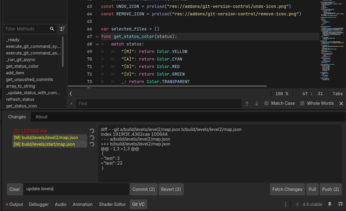 - When you revert files with git, godot's editor doesnt update them at all. You have to literally restart the editor to see the revert. I am not sure if thats a godot issue or I have to add something to the addon to tell godot to update itself