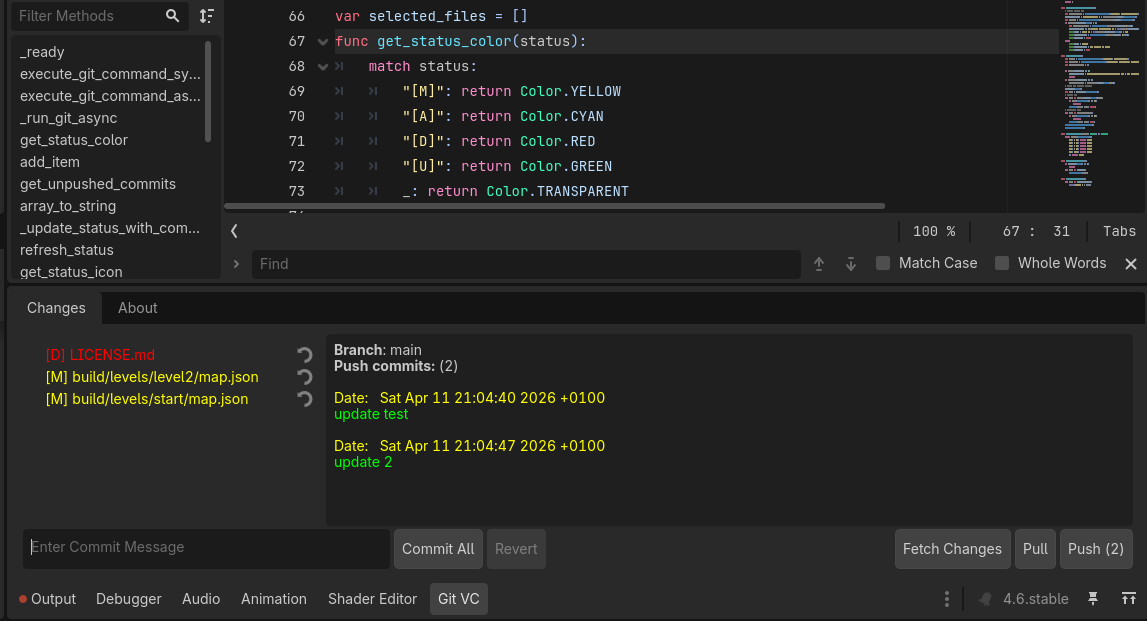 A gdscript plugin for godot that adds git features to it. Diff, commit, revert, push, pull, etc